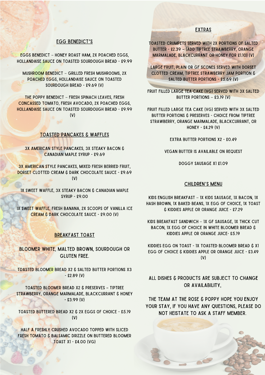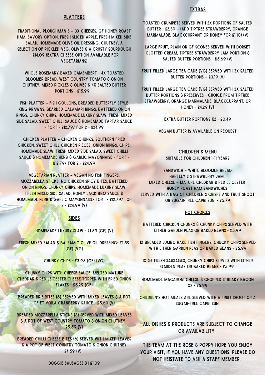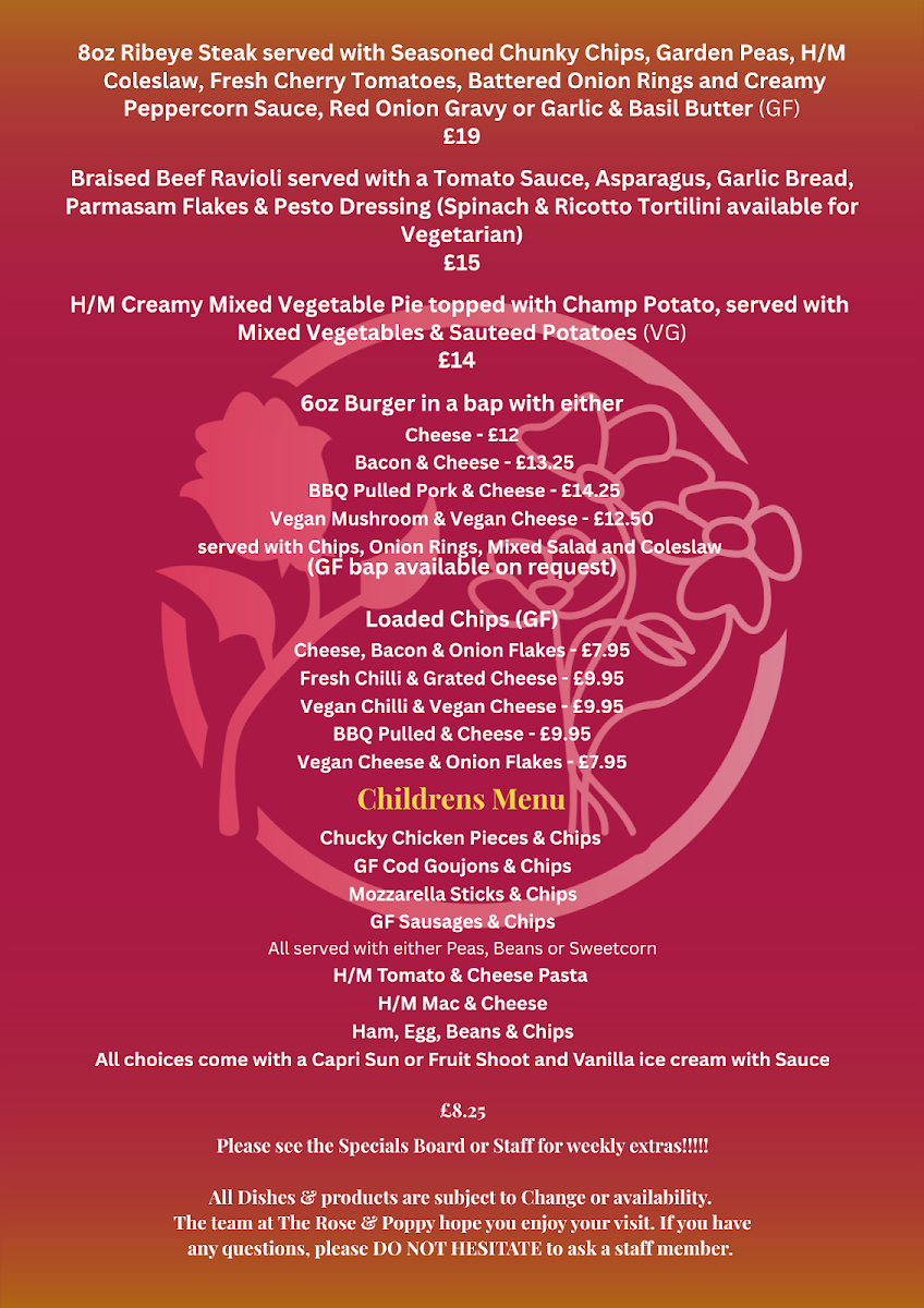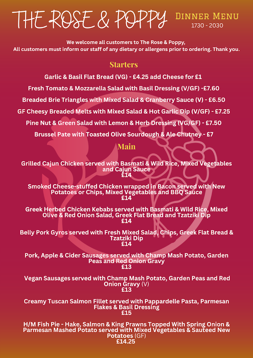 The menu at The Rose and Poppy offers a variety of options suitable for different mealtimes including breakfast, light meals, and casual dining. It features a selection of salads, toasted pancakes and waffles, and a children's menu designed for younger guests.