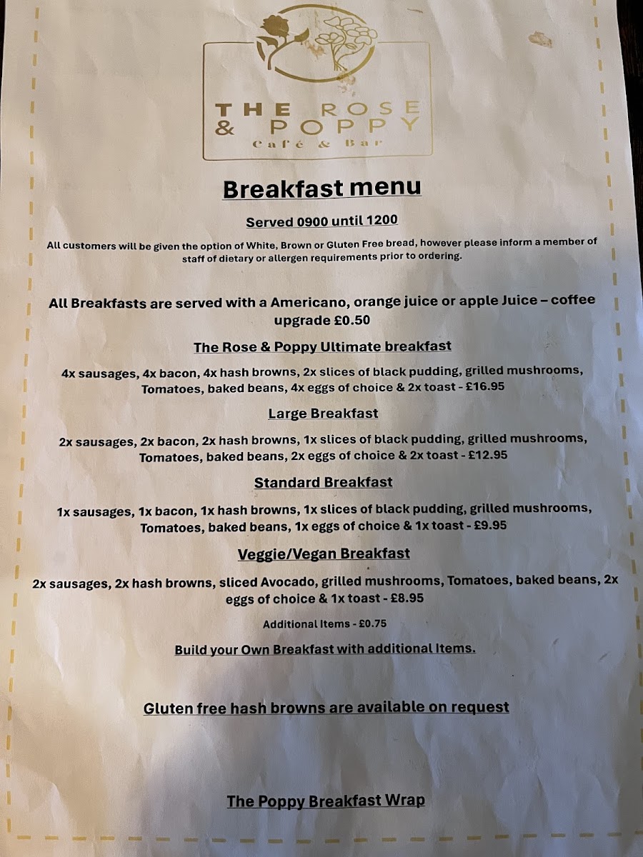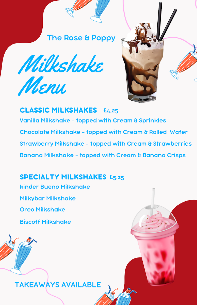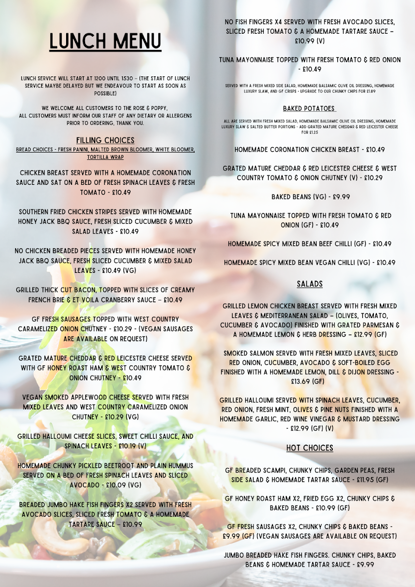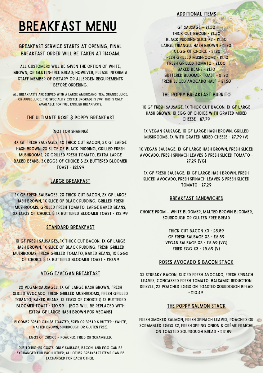 The menu at The Rose and Poppy offers a variety of options suitable for different mealtimes including breakfast, light meals, and casual dining. It features a selection of salads, toasted pancakes and waffles, and a children's menu designed for younger guests.